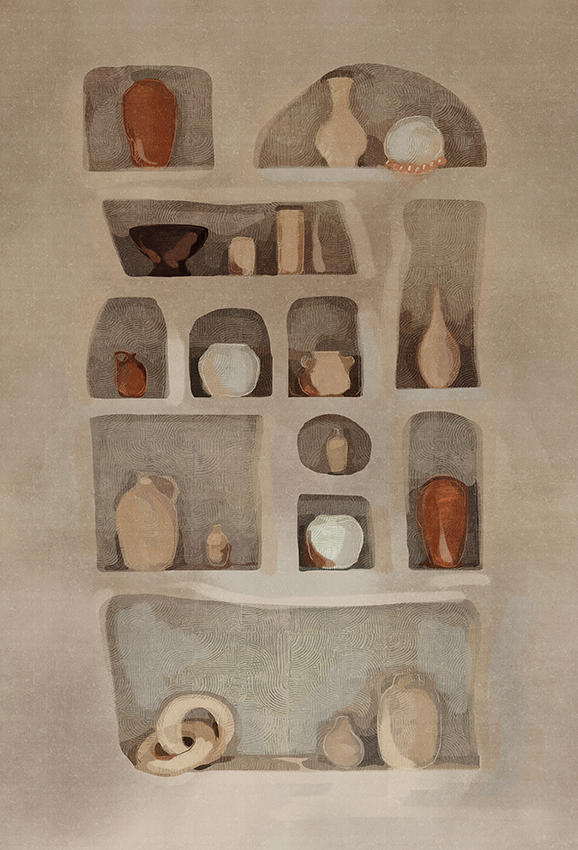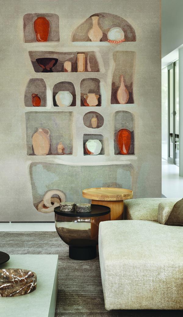 Această colecție celebrează estetica mediteraneană, reproducând texturi tipice și culori pudrate, scoțând în evidență eleganța și stilul său: o reinterpretare a pereților, caselor și betonului, ca simboluri ale arhitecturii și durabilității, îmbogățite cu finisaje artistice. Muralul este disponibil în două variante: una caldă, metalizată, în nuanțe de auriu și teracotă, și una rece, în argintiu și alb, care reprezintă o bibliotecă în care vase și ulcioare sunt expuse ordonat și precis. Designul creează un efect dinamic, perfect pentru a oferi profunzime și eleganță peretelui și pentru a transmite un echilibru între căldură și rafinament — ideal pentru spațiile contemporane care își doresc o notă de stil și personalitate.