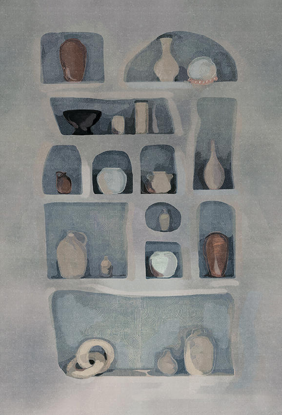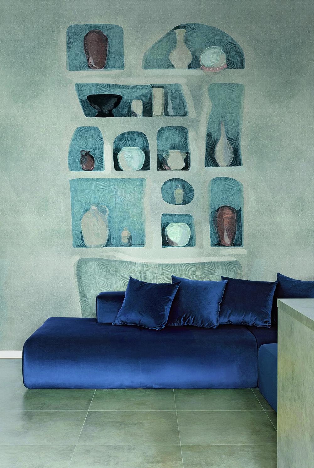 Această colecție celebrează estetica mediteraneană, reproducând texturi tipice și culori pudrate, scoțând în evidență eleganța și stilul său: o reinterpretare a pereților, caselor și betonului, ca simboluri ale arhitecturii și durabilității, îmbogățite cu finisaje artistice. Muralul este disponibil în două variante: una caldă, metalizată, în nuanțe de auriu și teracotă, și una rece, în argintiu și alb, care reprezintă o bibliotecă în care vase și ulcioare sunt expuse ordonat și precis. Designul creează un efect dinamic, perfect pentru a oferi profunzime și eleganță peretelui și pentru a transmite un echilibru între căldură și rafinament — ideal pentru spațiile contemporane care își doresc o notă de stil și personalitate.