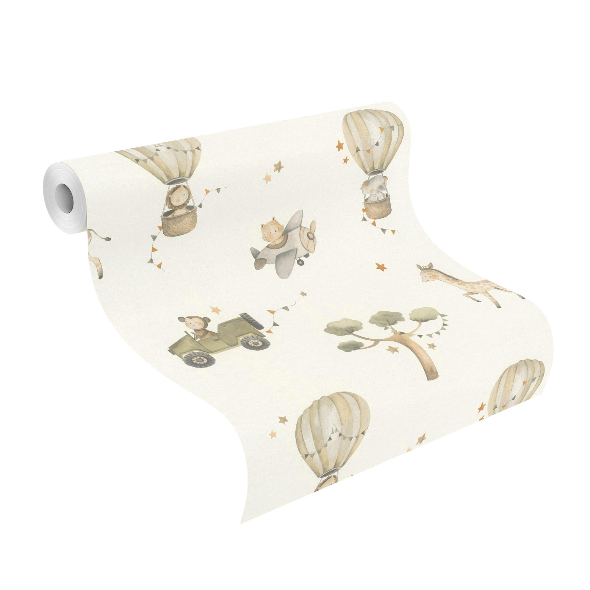 Acest tapet fermecător din vlies aduce aventuri jucăușe în camera copilului. Animăluțe precum o maimuță într-un jeep, un leu și un elefant în baloane cu aer cald și o pisicuță într-un avion explorează lumea într-un mod plin de imaginație și afecțiune. Tonurile naturale delicate și ilustrațiile fine în acuarelă creează o atmosferă caldă și liniștitoare. Copăceii prietenoși și steluțele completează tabloul și îi invită pe cei mici să viseze și să descopere. Tapetul este realizat din material vlies de înaltă calitate, ușor de aplicat și durabil – perfect pentru o cameră de copii confortabilă și plină de aventură.