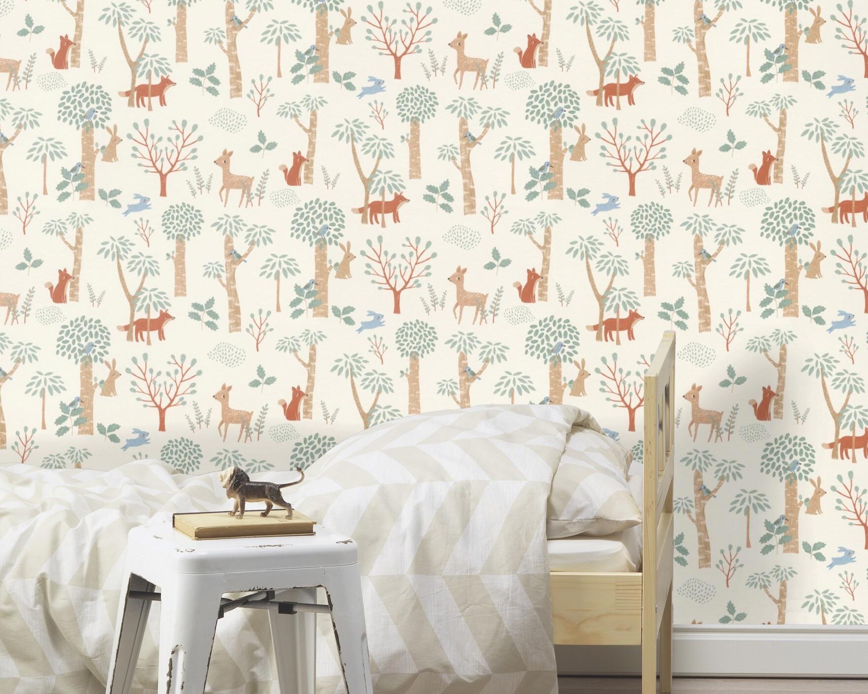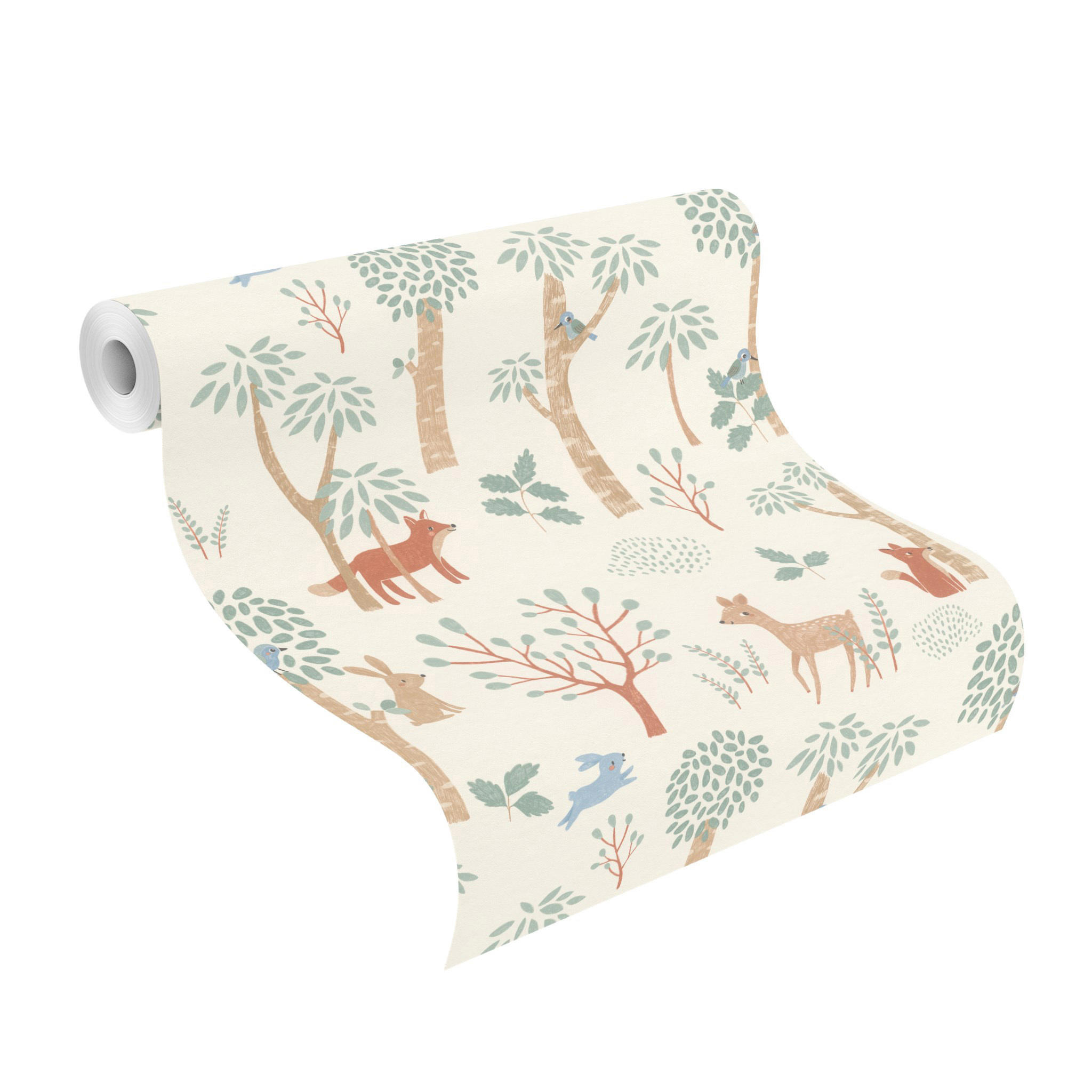 Acest tapet fermecător din vlies aduce în camera copilului atmosfera liniștită a unei păduri. În tonuri naturale blânde, precum bej, maro, albastru și verde, sunt ilustrate cu drag animale precum căprioare, iepurași, vulpi și păsări, ascunse printre copaci și tufișuri stilizate. Ilustrațiile prietenoase pentru copii emană căldură și siguranță, creând un mediu natural și liniștitor pentru micii exploratori. Tapetul este de înaltă calitate, ușor de aplicat și oferă o idee armonioasă de amenajare pentru camera copilului.